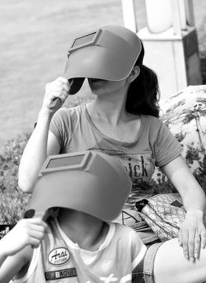 ↑7月22日,在浙江省宁波市三江口,市民用电焊面罩观看日全食。当日,我国大部分地区出现日食景观。除了专业观测镜、天文望远镜等专业装备,各地天文爱好者“各显神通”,妙招频出,用自己的方式观看日食奇观。 新华社记者 张培坚 摄