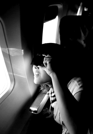 ↓海航乘客在空中用X光片看日全食。 本报记者 苏晓杰 摄