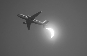 ↑7月22日,在广州白云机场附近,一架起飞的民航班机与月牙形的太阳相映成趣。 新华社记者 陈晔华 摄
