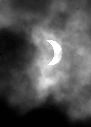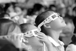 记者看到,没领到日食观测镜的孩子们为了更好地观测日食,各出绝招。有人蹲在排水沟前,认真地看水面日食的倒影;有人用曝光过的胶片观测,还有人用涂过墨水的玻璃看日食。8时37分,天空有薄薄的乌云飘过,太阳光芒稍减,人们用肉眼也能直接清晰地看到日偏食景象了。太阳在一点点‘亏损’,大约有四分之一被月亮掩盖了它的光芒。