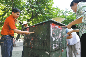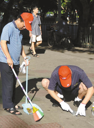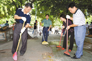 | ↑→←七月二十五日,省直机关上千名党员干部利用公休日时间,走上海口街头进行大扫除。 本报记者 王凯 摄 |