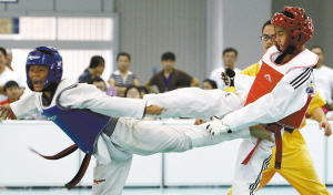 | 7月25日,2009年海南省跆拳道锦标赛在海口会展中心举行。 本报记者 宋国强 摄 |