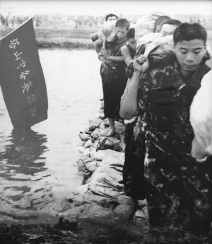 | 套题图片:李向群生前与战友一起在抗洪一线扛沙袋。
