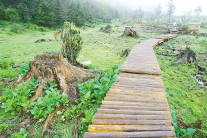 | 神木垒草甸的沼泽地,错落穿插着形状各异、年久的树桩。 |