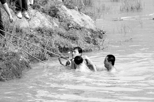 7月26日,村民在池塘中搜救溺水学生。 当日,黑龙江省哈尔滨市道里区新发镇五星村四名小学生在池塘戏水时发生悲剧,三名学生溺水身亡,其中年纪最大的12岁,最小的10岁。 新华社发(肖劲彪 摄)