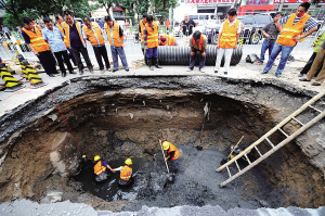 塌陷 7月27日,工人正在抢修塌陷的路面。当天,北京市朝阳区石佛营附近一处道路发生塌陷,塌陷的洞口宽约2米,长约4米,深约3米,洞中有少量积水。事件发生后,交警对车流进行了疏导。 据市政维修人员介绍,此次塌陷可能与近期北京的强降水天气有关。新华社发