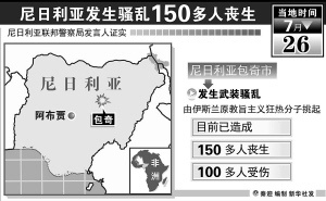 新华社拉各斯7月27日电(记者李怀林)尼日利亚联邦警察局发言人伊曼纽·奥珠库27日向新华社记者证实,尼西北部包奇州首府包奇市26日发生武装骚乱,目前已造成150多人丧生,100多人受伤。