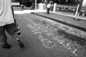 7月23日,海口市三角公园旁,彩票迷在路面胡写乱画。