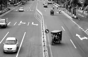 7月25日下午,海口市海甸岛人民大道,一辆三轮车违章调头逆行。