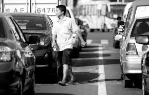 7月27日下午,海口市龙昆南路,派发小广告者在车流里穿行。