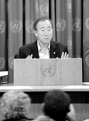 | 7月29日,潘基文在每月例行记者招待会上发表讲话。潘基文说,他对朝鲜近来作出有关拒绝重返六方会谈的决定表示关切,并对朝鲜关闭对话渠道感到不安。 新华社记者 顾震球 摄 |