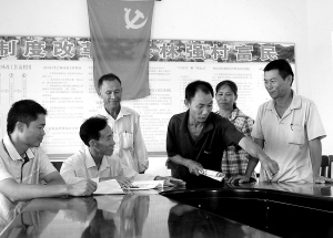 | 昌江推行“两委”干部坐班制,图为昌江乌烈镇纳凤村委会办公大楼里,村委会副主任文国章(左二)接待村民来访。 本报记者 陈德雄 摄 |