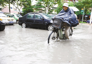 7月30日,一位骑自行车的市民涉水经过上海衡山路。新华社发