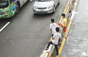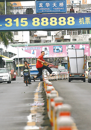 现场曝光 这组照片摄于7月21日的海口龙华路,10天过去了,在海口的各条街道,这种危险的“跨栏大赛”每天仍在上演。 本栏照片均由本报记者古月摄