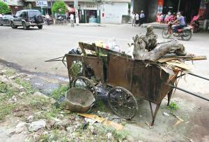 | 七月三十日,白沙黎族自治县牙叉南路上,手推车装满了生活垃圾,恶臭的污水顺着马路流淌。 本报记者 苏晓杰 摄 |