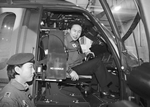 7月31日,韩国总统李明博(右)在韩国南方城市泗川举行的新机型揭幕仪式上体验新型直升机“Surion”。当日,韩国第一架国产新型军用运输直升机“Surion”下线,“Surion”的韩语意思是“雄鹰百分百”。这种新型军用运输直升机量产后有望取代韩国现役的美制直升机编队。 新华社/路透
