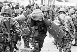 7月30日,在洪都拉斯首都特古西加尔巴,警察试图驱散集会者。当日,洪都拉斯被罢免总统塞拉亚的支持者在这里举行大规模游行,并与当地军警爆发大规模冲突,多人受伤。 新华社发(戴维摄)