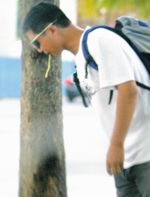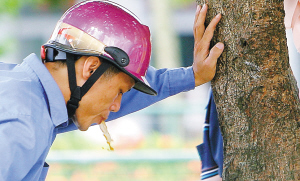 | ←7月25日,在海口汽车南站,一名摩托车司机在树旁乱吐槟榔汁。 |