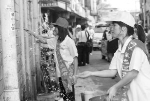 | 在海口环境大整治行动中,青年志愿者在社区清理墙面。 本报记者 苏建强 摄 |