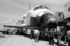 7月31日,在美国佛罗里达州肯尼迪航天中心,地面工作人员在平安返航的美国“奋进”号航天飞机上工作。美国东部时间31日10时48分,“奋进”号航天飞机平安降落在肯尼迪航天中心,结束了为期16天的国际空间站建设之旅。 新华社/法新
