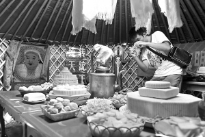 7月31日,一名旅游者在内蒙古正镶白旗察哈尔旅游文化周开幕式上欣赏造型各异的蒙古族传统奶食。 当日,为期六天的内蒙古察哈尔旅游文化活动周在内蒙古锡林郭勒盟正镶白旗草原上开幕。期间将集中展出蒙古族察哈尔部传统文化艺术作品、举行传统器乐声乐互动展演及草原饮食文化产品竞赛,展示蒙古族察哈尔部传统文化风情。 新华社记者 张领 摄