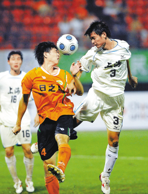 8月1日,在山东济南举行的全运会男子足球甲组的冠军争夺战中,上海队以3:0战胜广东队,获得冠军。图为上海队队员张智(右)与广东队队员陈建龙在比赛中争顶头球。 新华社发
