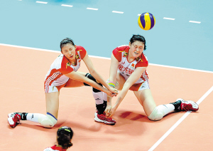 8月1日,在2009世界女排大奖赛宁波北仑赛区的比赛中,中国队以3:0战胜韩国队。图为中国队队员王一梅(右)与队友在比赛中救球。 新华社发