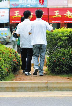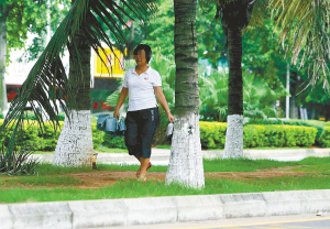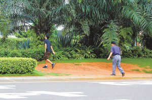 | ←8月2日下午5点31分,在海口市红城湖路,几位市民沿着隔离绿化带被践踏破坏而成的“泥路”行走,违章过马路。 |