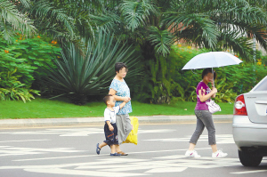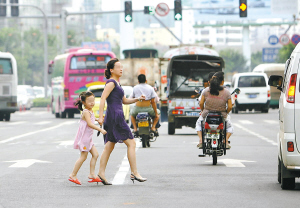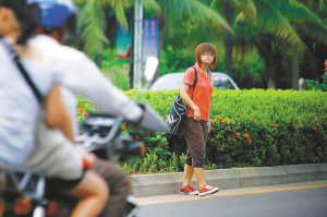 | →8月2日下午5点32分,在海口市红城湖路,一位女孩子踏过隔离绿化带,违章过马路。 |