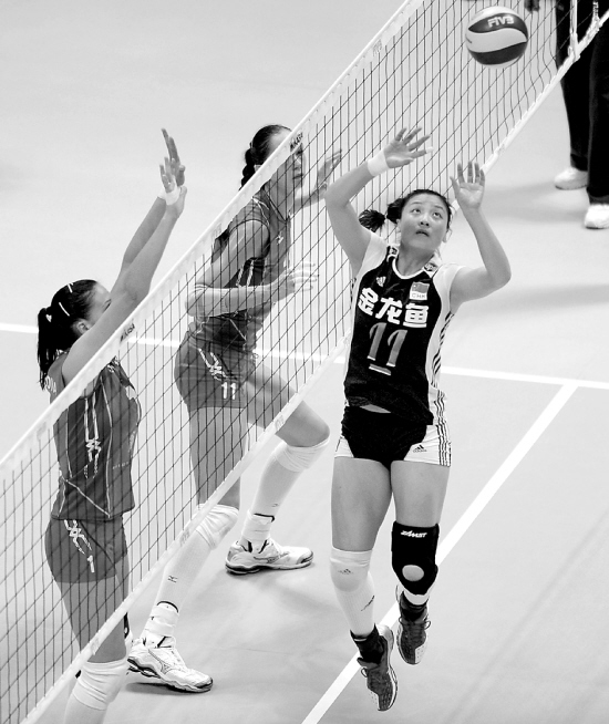 8月2日,在2009世界女排大奖赛宁波北仑赛区的比赛中,中国队以3:2击败俄罗斯队,并以三战全胜的战绩夺冠。图为魏秋月(右)在比赛中传球。 新华社发