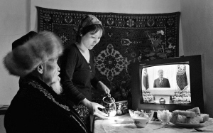 8月2日,在吉尔吉斯斯坦比什凯克附近的一个村子,村民们观看总统就职仪式电视直播。吉尔吉斯斯坦总统巴基耶夫2日在吉首都比什凯克宣誓就职,开始他第二个总统任期。 新华社/法新