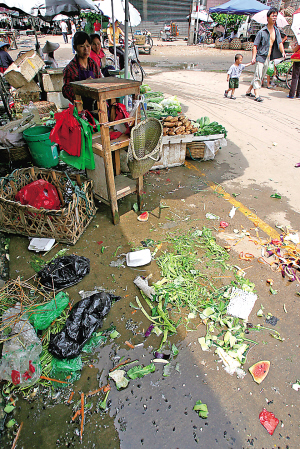 | ↑8月2日,海口东门露天农贸市场烂菜叶随地乱扔。 |
