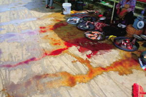 | →8月2日,市场内卖鱼摊位血水染红地面。 |