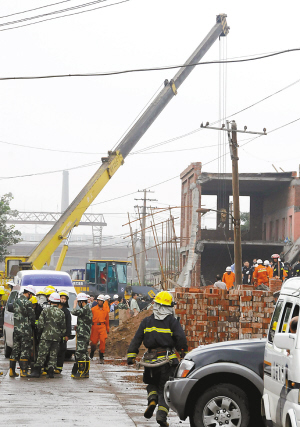 8月4日,消防队员在石家庄市西兆通镇坍塌事故现场抢救被埋人员。 当日9时15分左右,石家庄市正遭遇一场强降雨,不时电闪雷鸣。位于该市西兆通镇南石家庄村的腾飞玛钢铸造有限公司在建厂房突然倒塌,有20多名施工人员和过路人员被埋在废墟中。 据记者从事故抢险指挥部了解的最新情况,目前已找到被埋人员20人,其中已经有17人遇难,还有3人在医院抢救。 新华社记者 巩志宏 摄