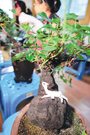 8月4日拍摄的一盆名为“巨岩卧鹿”的活体何首乌根雕盆景。 杭州市民张欢苗老人历时10多年,精心创作了20余盆活体何首乌根雕艺术盆景。这些何首乌根雕盆景造型生动,令人称奇。 新华社发(李忠 摄)