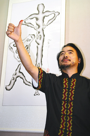 8月3日,著名书画家武微波的形体图腾书画作品《中国人》在海南泰达·美丽道画苑首次公开拍卖,560万元的成交价格在业内引起了不小的反响,这也创下了当代书画家作品在我省拍卖的最高记录。在拍卖现场,武微波还做出了一大举动:在《中国人》作品上按下了自己大拇指的纹印。这就是武微波,一个不愿循规蹈矩、充满了奇妙想象和无限激情的书画家,被业内人士称为“江北一怪”。