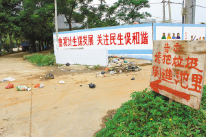 → “告示”形同虚设,居民垃圾随意抛。 本报记者 李关平 摄