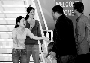 | ↑5日,被释放的两名美国女记者李丽娜(左一)和凌志美(左二)抵达美国加利福尼亚州的伯班克。 新华社/法新 |