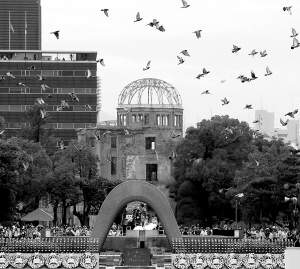 8月6日上午,在日本广岛和平纪念公园,一群鸽子从原子弹轰炸纪念遗址上空飞过。当日是日本广岛遭受原子弹轰炸64周年纪念日。日本各界在此举行大规模集会,悼念原子弹轰炸死难者,祈祷世界和平。 新华社记者 任正来 摄