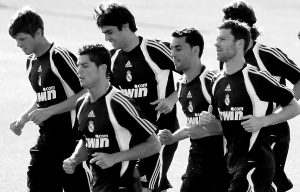 8月6日,从英超利物浦队转会到皇家马德里俱乐部的西班牙人阿隆索第一次参加球队的训练。图为阿隆索(右)与队友克·罗纳尔多(左二)、卡卡(左三)等在训练中。 新华社发