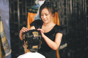 与以往电影官网启动仪式不同,此次发布会特意安排摆放了许多博物馆古董级家具。姚树华和郝蕾现场示范为女模特“梳头”插文物发髻,令在场媒体倍觉新颖。