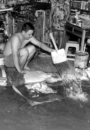 | 8月6日晚,海口凤翔路上一小杂货店主正在排水。 本报记者 王 军 摄 |