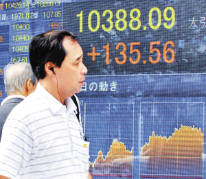8月6日,行人经过位于日本东京一块股票信息电子显示屏幕。当时东京股市日经225种股票平均价格指数上涨1.32%。 新华社/法新