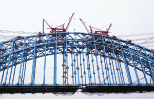 即将合龙的京沪高速铁路南京大胜关长江大桥局部(8月5日拍摄)。国家重点工程、京沪高速铁路南京大胜关长江大桥经过中铁大桥局项目部职工近三年的紧张施工,将于近日合龙。大胜关长江大桥是京沪高速铁路、沪汉蓉I级铁路干线以及南京地铁的过江通道,全长9.273公里,具有体量大、跨度大、荷载大和通车速度高的特点。 新华社发