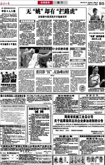 海南日报 体育新闻 013 2009-08-071 2009年08月07日 星期五