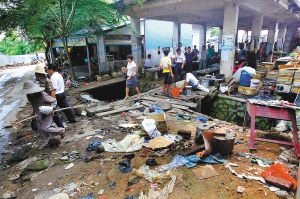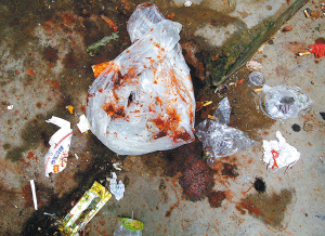 市场内有一个大型的家禽屠宰点,鸡、鸭、鹅的粪便和羽毛遍地都是,地板上还有一摊摊宰杀家禽后留下的血迹,而这一切很快就能被店主不留痕迹地“清理”干净。