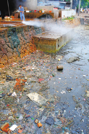 只见店主将羽毛装进塑料袋后,面对污水、血水横流的地面,他拿着高压水枪对地板进行冲洗,污水、垃圾直接流向了港湾内,附近的水面上已经被染红了一片。