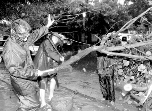 | 7日上午,临高县公安局的干警上路清理县城里的倒伏树木。 本报记者 王 军 摄 |