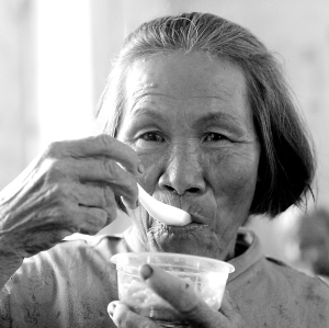 | 7日中午,受灾群众在东英中学吃上了政府为他们准备的午饭。