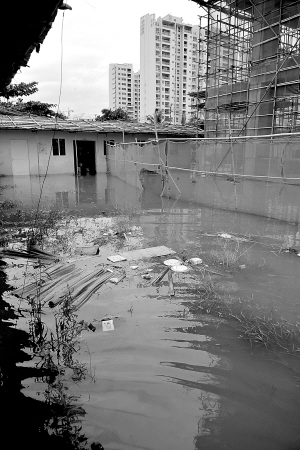 | 8月7日下午,海口市海甸五西路一处正在修建的楼盘还被泡在积水中。